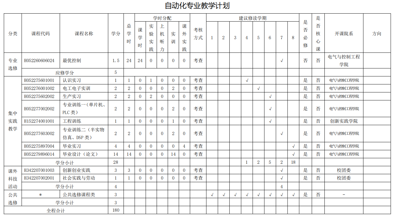 包括电工电子实训、专业训练一(单片机、PLC类)、专业训练二(半实物仿真、DSP类)、认识实习、生产实习、毕业实习、毕业设计等。