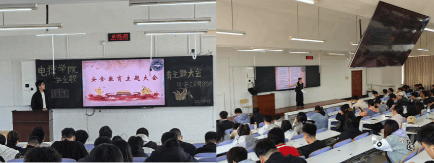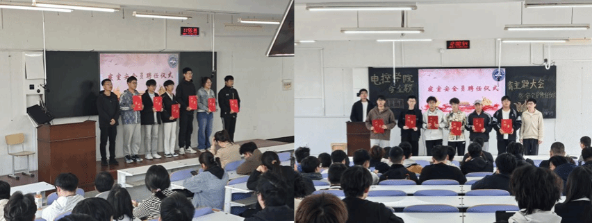 聘任仪式结束后,随即召开了安全教育主题大会。大会通报了近期查寝过程中发现的寝室内违规行为,通过此类违规行为告诫同学们引以为戒,在宿舍内安全用电,共建安全、文明、卫生的宿舍环境。最后,寝室安全员们通过视频学习了消防器材的使用,这也进一步强化了寝室安全员的安全实操能力。