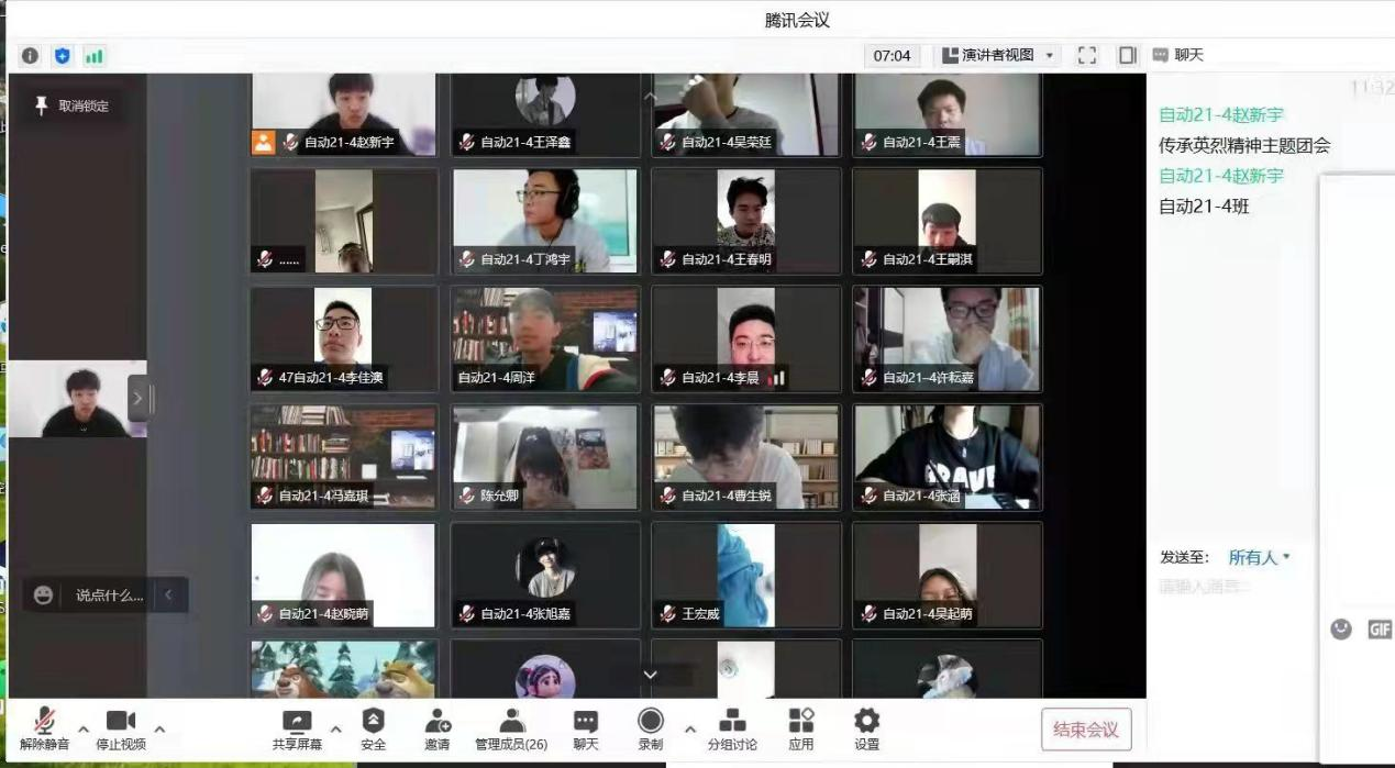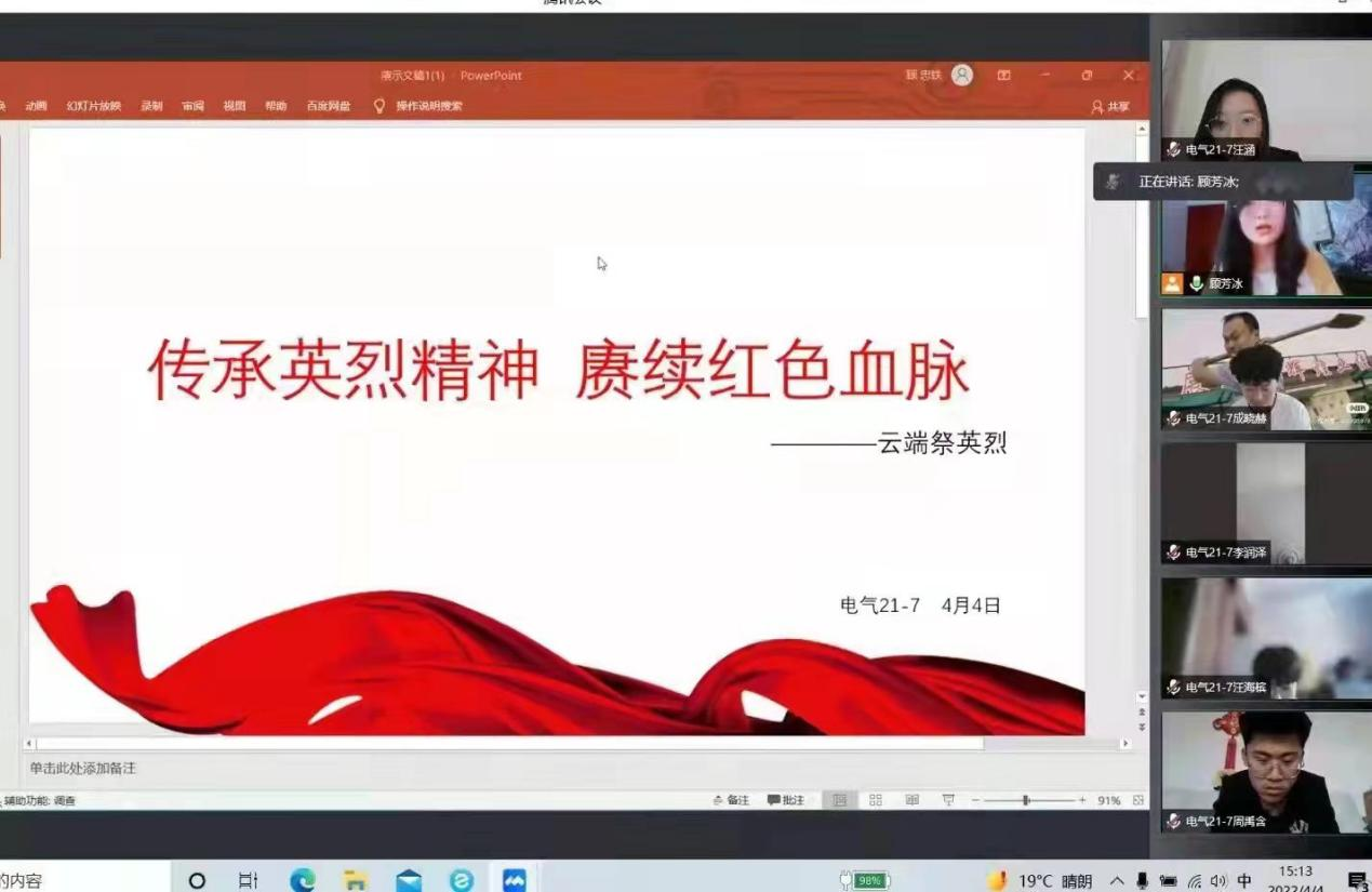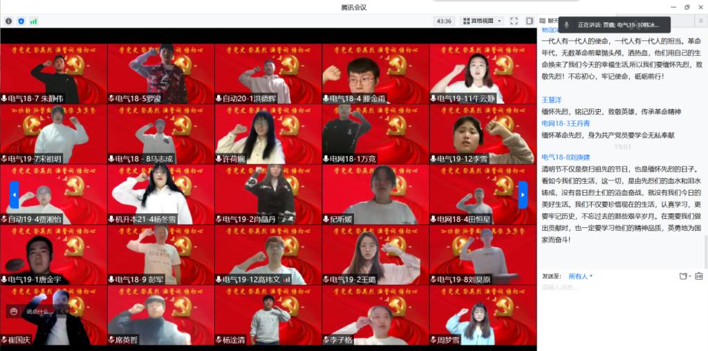 在“云端祭英烈”主题党日活动中,各支部学生党员代表发言。 学生一党支部:自动化19-3班关蒙将对英雄的崇敬之情,转化为拼搏奋斗的强大动力;电网20-4班李娜奇讲述抗疫故事,让我们感恩并铭记疫情中奋战的白衣勇士;学生二党支部:电气19-8班周末快乐分享了抗疫烈士、弘扬爱国主义的时代先锋吴涌同志的事迹;电气19-7班王嘉宁讲述的刘传文烈士的事迹让每位党员深受感动;学生三党支部:电气19-11班周嘉明号召支部党员像北京大学援鄂医疗队的90后党员一样,用行动证明新时代的中国青年堪当大任;测控19-1班陈琪琪号召青年党员牢记先烈遗志,不忘初心、牢记使命,砥砺前行。在各党员代表发言的同时,支部其他党员也积极展开谈论,在公屏中分享和交流对英雄事迹的感悟。
