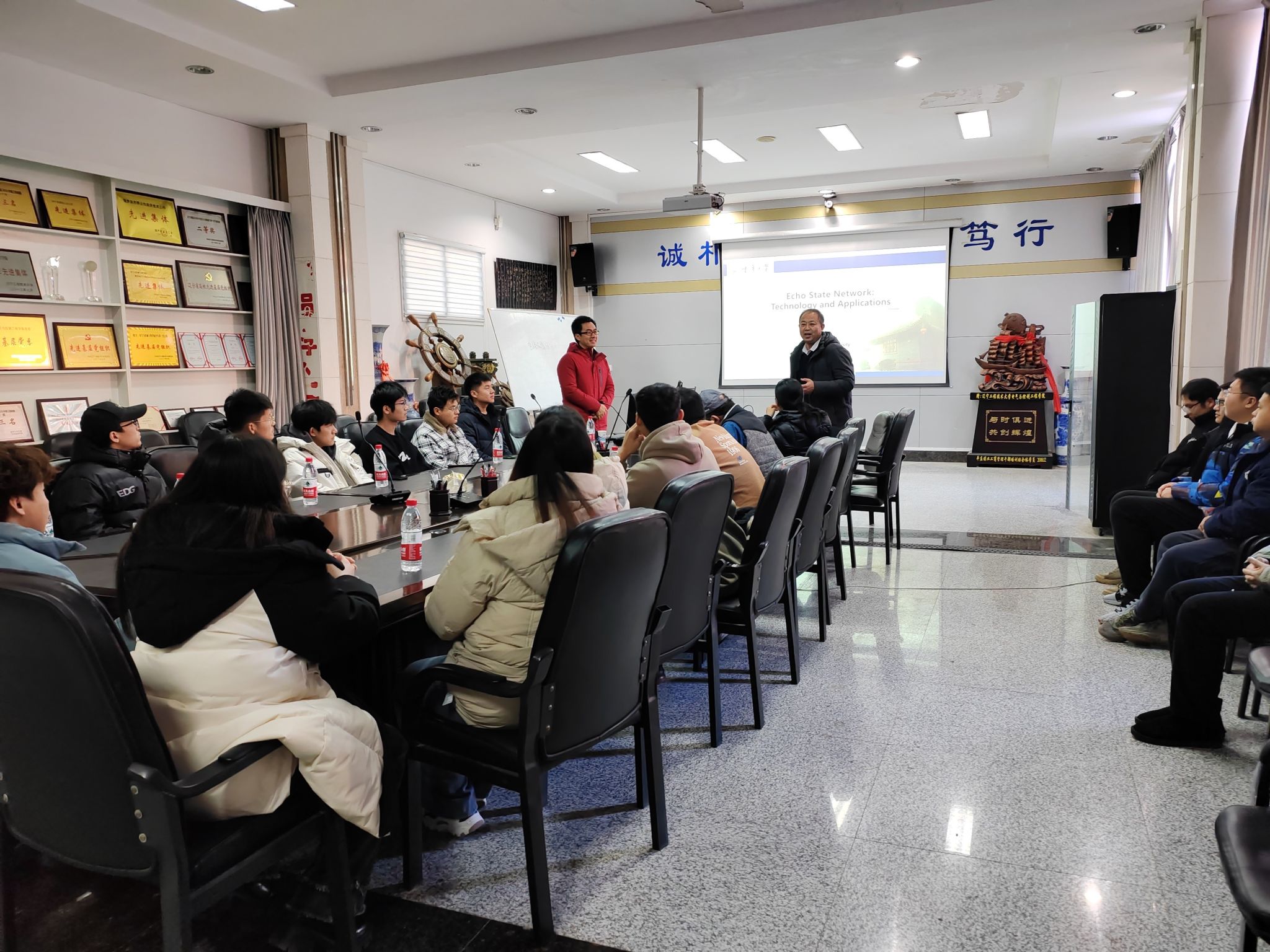 在报告中,伍洲教授主要围绕回声状态网络(Echo State Network, ESN)展开讲解,深入剖析了这一技术的工作机理、研究热点和未来发展方向。伍洲教授指出,递归神经网络通过在前向结构中引入循环连接,使得网络在处理新输入的同时能够存储历史输入信息,这一特点使其非常适合处理时间序列预测、自然语言处理等具有时间关联性的学习任务。此外,伍洲教授还特别强调了递归神经网络在能源领域的应用,如太阳能预测等时序预测任务,并分享了一些前沿的研究成果,深受师生好评,大家纷纷表示受益匪浅。