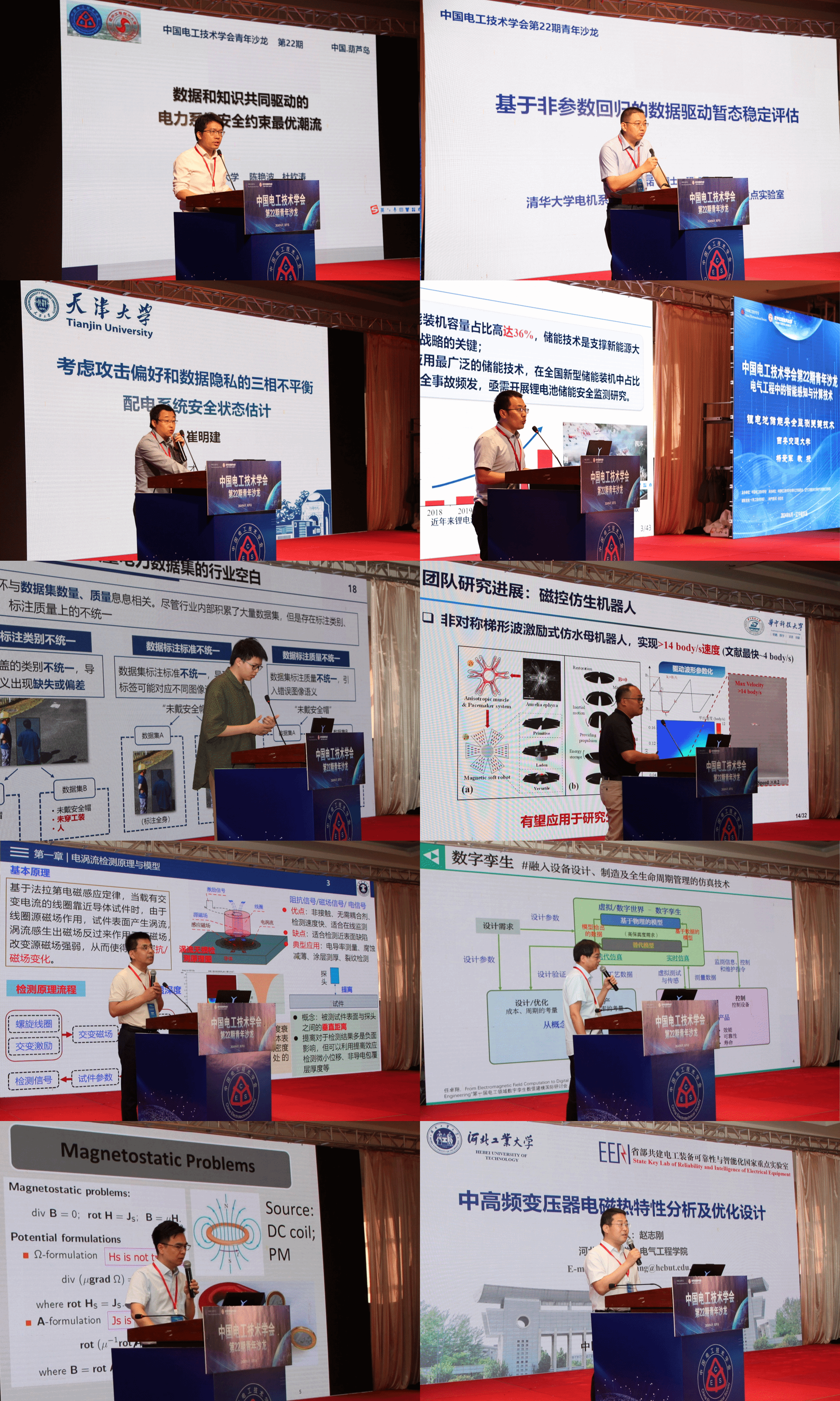 本次沙龙邀请了来自国内知名高校的十位青年专家带来了电气工程中的智能感知与计算技术领域的青年专家主旨报告。青年专家主旨报告环节由沈阳理工大学吴东升教授、沈阳工业大学任自艳教授和辽宁工程技术大学闫孝姮副教授主持。国家优青、辽宁工程技术大学兼职博导、清华大学陈磊研究员分享了“基于非参数回归的数据驱动暂态稳定评估”,国家级青年人才、华北电力大学陈艳波教授分享了“数据和知识共同驱动的电力系统安全约束最优潮流”,海外优青、天津大学崔明建教授分享了“考虑攻击偏好和数据隐私的三相不平衡配电系统安全状态估计”,国家级青年人才、西安交通大学杨爱军教授分享了“锂电池储能安全监测关键技术”,浙江大学邓以恒博士生分享了“电力大模型的关键技术”,中国科协青年托举人才、华中科技大学曹全梁教授分享了“磁控软体机器人技术及其应用”,江苏省六大高峰人才、中国矿业大学范孟豹教授分享了“电涡流检测多绕组新变压器”,中科院电工研究所徐小宇副研究员分享了“数字孪生场景中的电磁计算替代建模研究”,国家级青年人才、武汉大学赵彦普教授分享了“基于有限元方法的电机及变压器仿真分析技术”,河北省三三三人才、河北工业大学电气工程学院副院长赵志刚教授分享了“中高频变压器电磁特性模拟研究”,并与参会人员进行探讨交流。