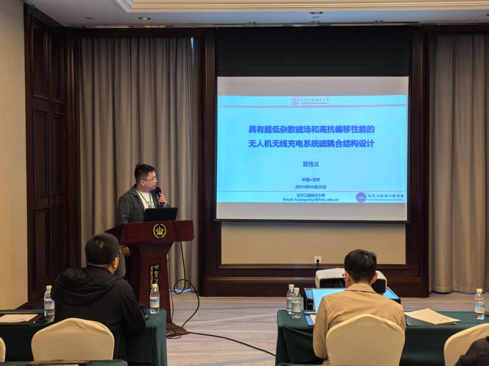 院长李洪珠,副院长侯利民、杨桢及青年教师黄伟义参会。黄伟义老师在电力电子装备与系统的拓扑、建模、仿真与测试分会场作“具有超低杂散磁场和高抗偏移性能的无人机无线充电系统磁耦合结构设计”学术报告。