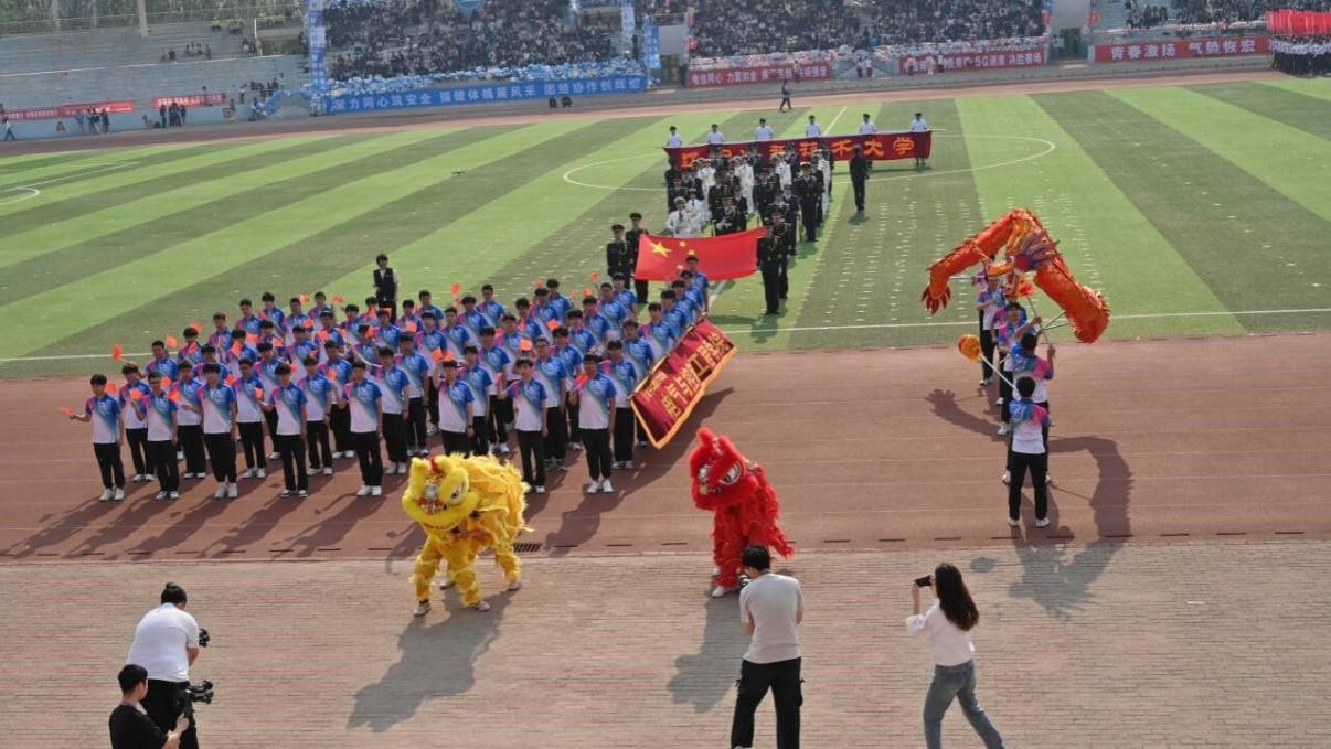 学生方阵中,舞龙和舞狮的精彩表演瞬间点燃全场。金黄狮身翻腾跳跃,红绸随舞步翻飞,刚劲中透着灵动,传统与活力进行着碰撞。队员们步伐整齐,手举国旗迎风舞动,当舞狮与现代方阵队列结合,传统文化在运动赛场焕发新生机,引来师生阵阵喝彩。