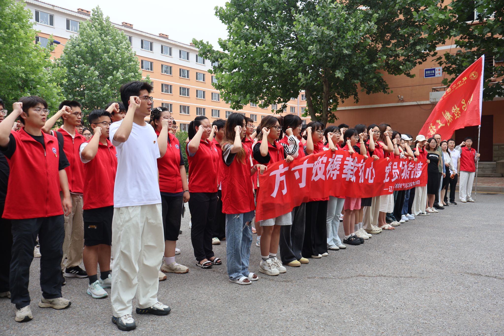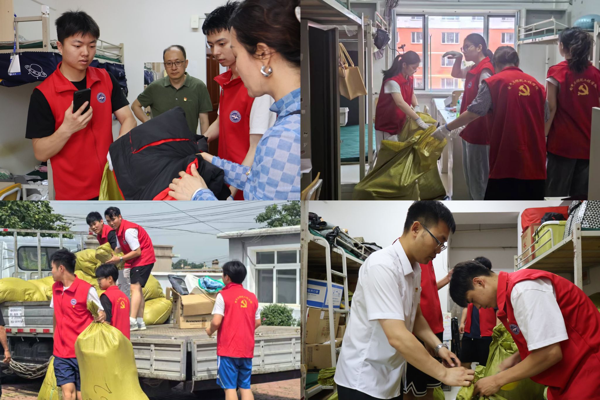 党委副书记兼纪委书记、副院长周筱淋,本科生学生党支部书记施振雷、李莹、武书宁、杨万里,公寓辅导员陈泽林,以及学生党员们列队肃立,高举右拳重温入党誓词。随后,学生党员前往大四毕业生寝室,整理毕业生不再需要的被褥,进行打包封装,为后续的捐赠活动做好充分准备。