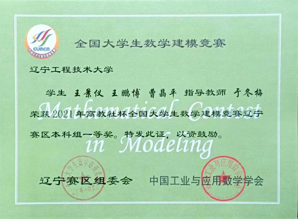 “诚朴求是,博学笃行”是辽宁工程技术大学的校训,也是她进入大学以来恪守的准则。进入大二学年后,开始接触到各种专业课如《电路》、《电磁场》等,学习难度上升,成绩有些许下滑。她更潜心研究,专心学习,在大二学年仍保持专业第一的成绩。在学习巩固专业知识的同时,她也注重实践方面的锻炼。通过班导师刘艳丽组织的竞赛讲座,激发了她对数学建模比赛的兴趣。万事开头难,只要肯攀登。第一次参加的辽宁省数学建模竞赛石沉大海,太阳石精神“坚韧顽强”鼓励着她,终于在经过几次锻炼后,她获得了全国大学生数学建模竞赛辽宁赛区本科组一等奖,还获得了“华数杯”全国大学生数学建模竞赛三等奖、全国大学生数学建模竞赛省三等奖、亚太杯三等奖。