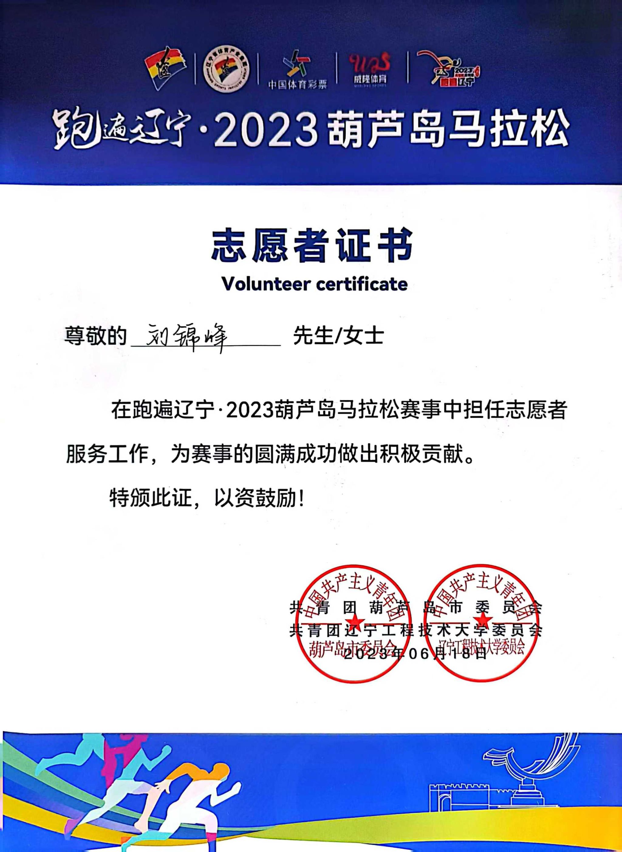 社会实践类:2023年,参加跑遍辽宁2023葫芦岛马拉松,获得志愿者证书。