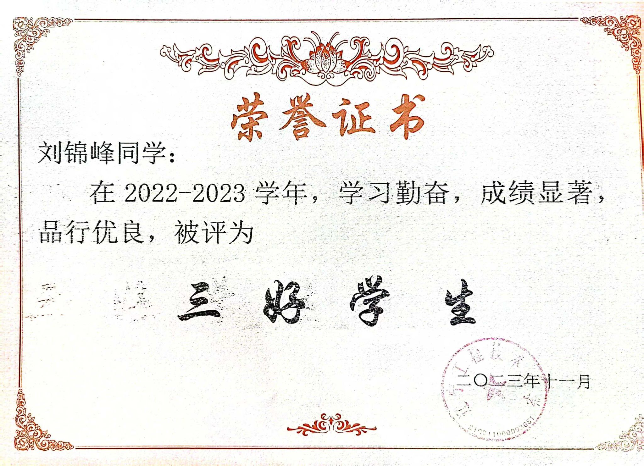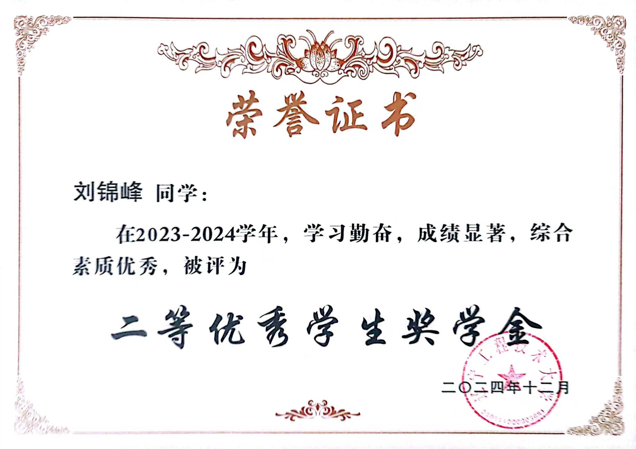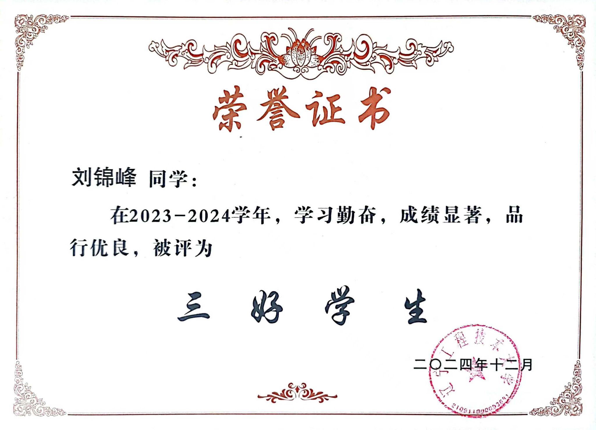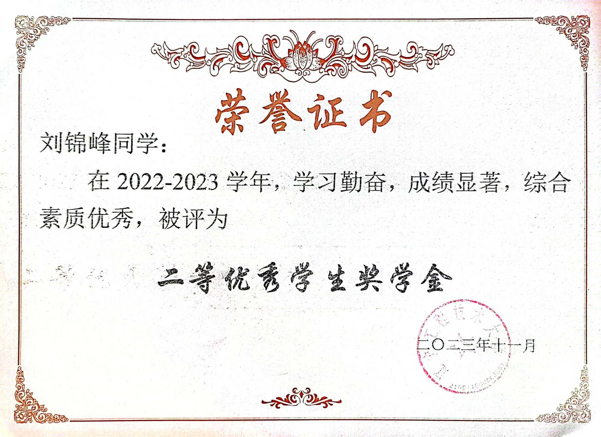 生活中,刘锦峰乐观豁达,常为学业困难同学耐心讲解难题、分享学习资料,助其提升成绩;关心同学生活状况;积极参与校园文化建设,社团活动,传递青春活力与正能量。