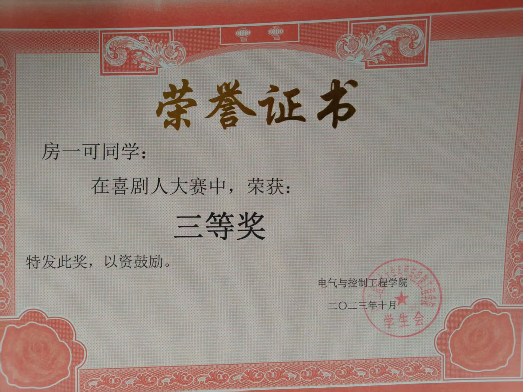 喜剧人比赛三等奖。