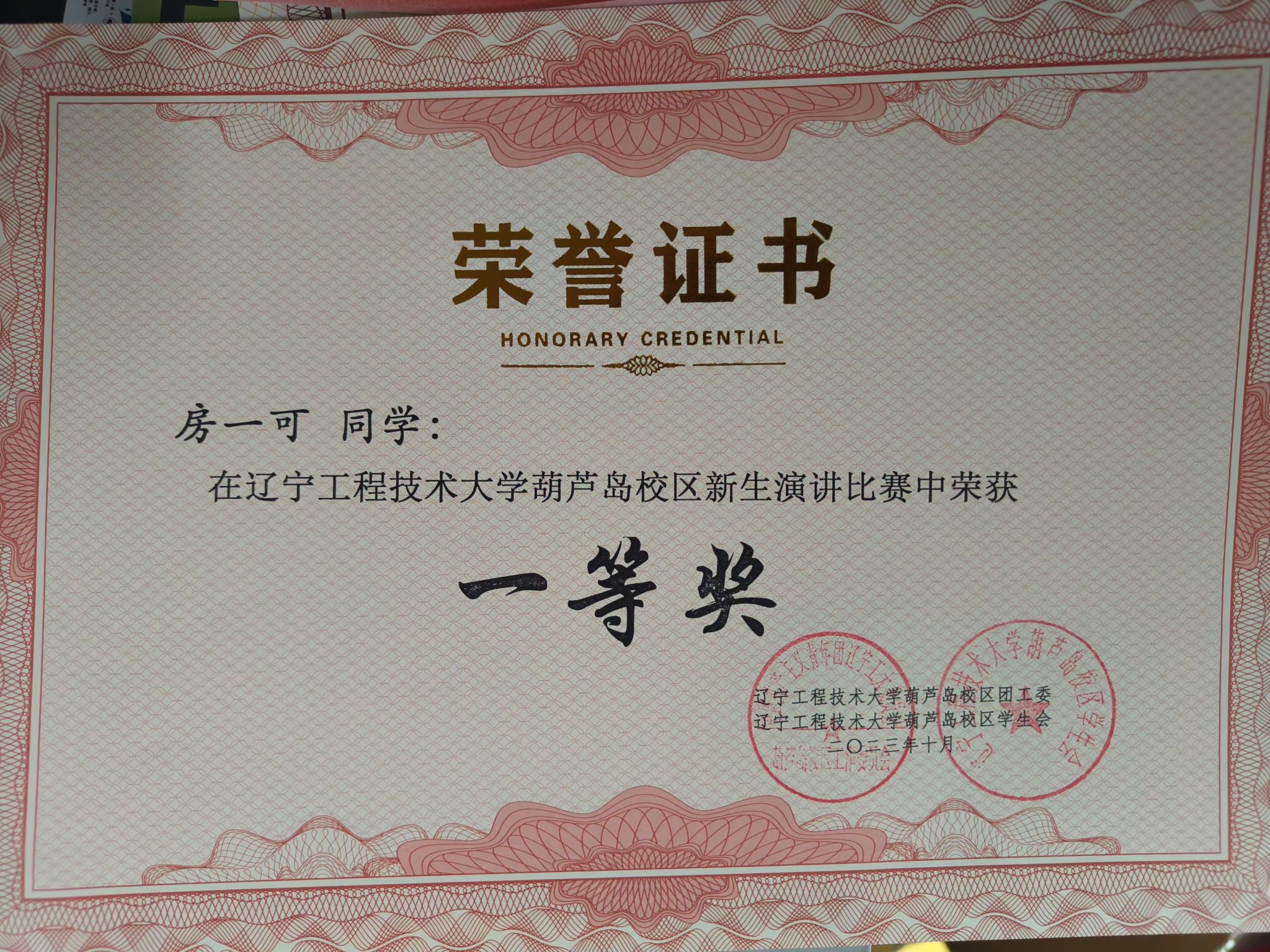 其他类:2023年,获得辽宁工程技术大学葫芦岛校区演讲比赛一等奖。