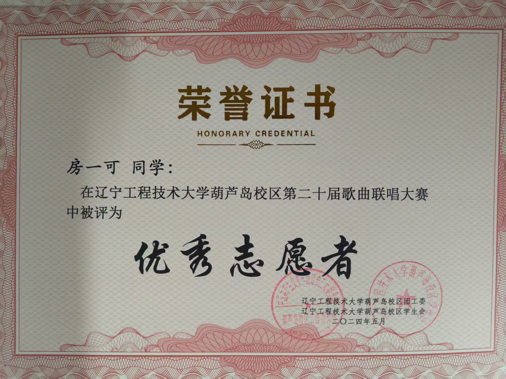 2023年,葫芦岛校区歌曲联赛优秀志愿者。