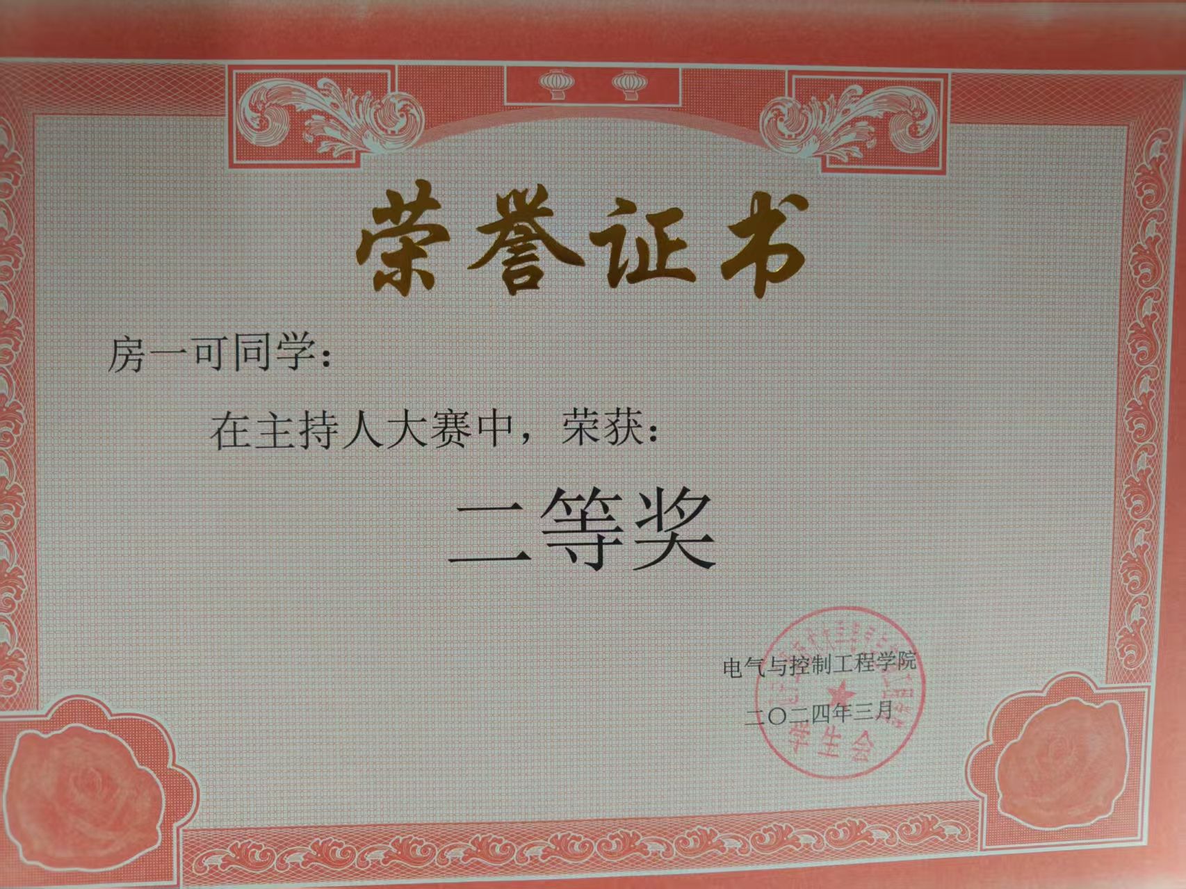 主持人比赛二等奖。