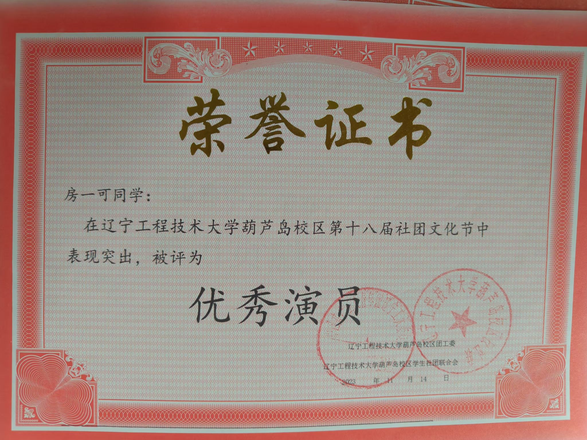 2023年,葫芦岛校区第十八届社团文化节优秀演员。